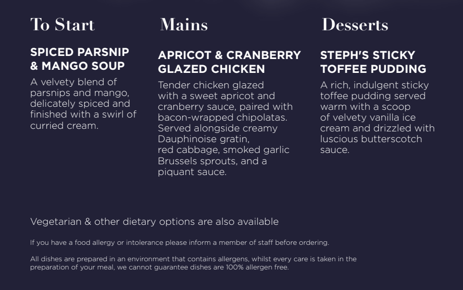At 7pm, you and your guests will take a seat at your dining tables, before dinner is served at 7.30pm. Here, you'll all be treated to a mouth-watering, three course meal that's been expertly created by the venue’s talented chef and their team.