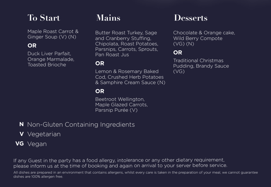 Christmas lunches are served daily between the 1st - 23rd December 2025 between 12:30 - 2:30pm