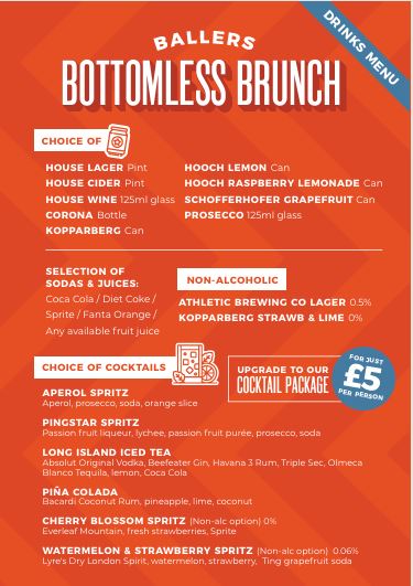For bookings that include many game options, your Bottomless Brunch is split into two parts: 60 minutes of bottomless drinks with gameplay, followed by 30 minutes of food and bottomless drinks at your bar table.