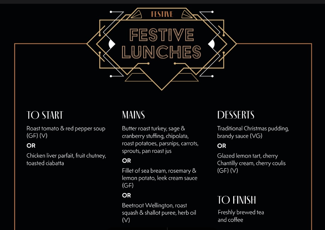 - Lunch served 12.30pm-2:30pm. - Available: 28th November - 22nd December. - £15 per person deposit is required at the time of booking, deposits are non-refundable and non-transferable. - Full balance is due by 31st of October 2025 or after this point we require payment in full. - Non Cancellable. Deposits, part payments & full payments are non-refundable & non-transferable under any circumstances. - Menus subject to change. - Please let us know about any dietary requirements.