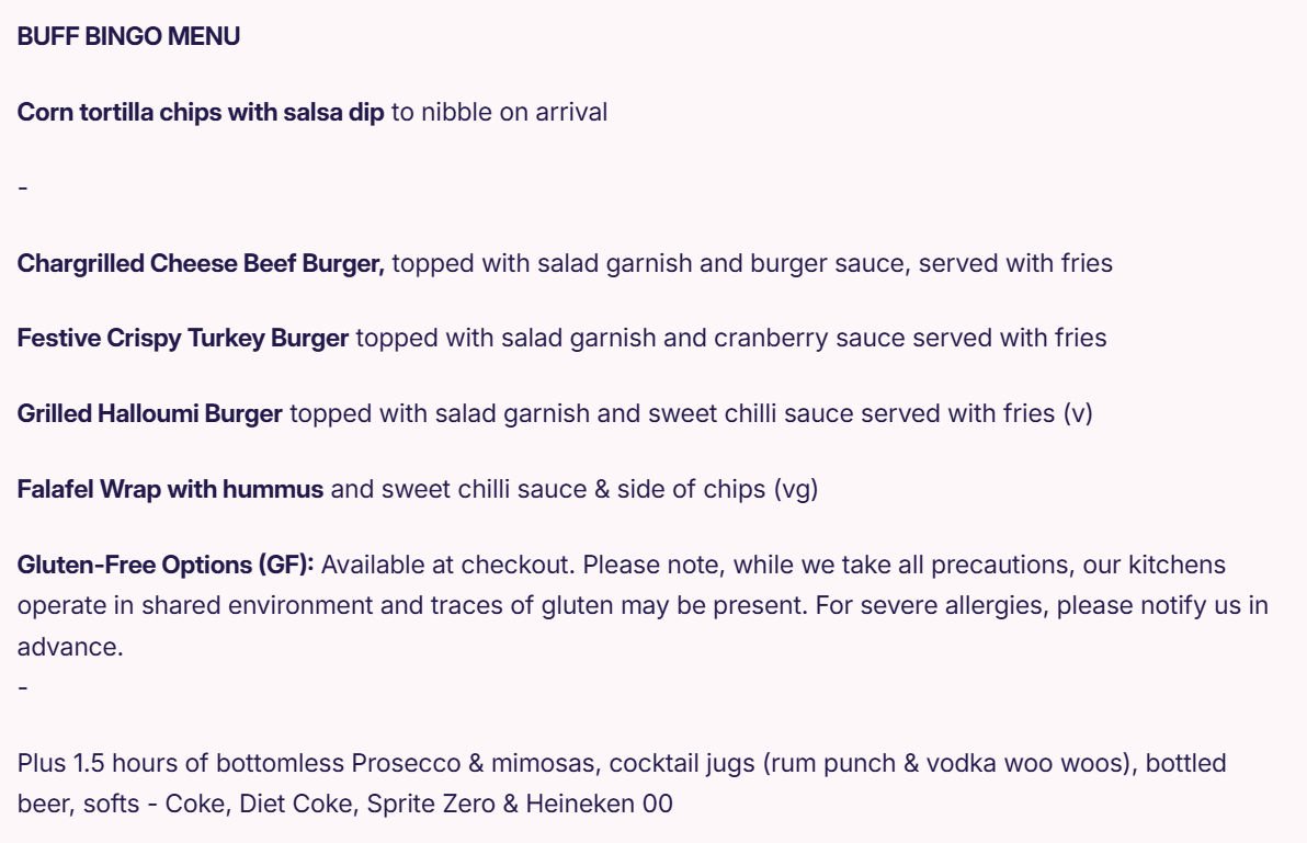 Get ready for 90 minutes of non-stop festive fun with bottomless prosecco, mimosas, rum punch, vodka woo woo, beer, and soft drinks!