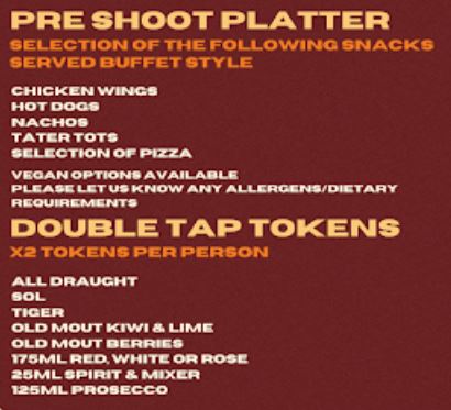 Before the action kicks off, enjoy a delicious Pre-Shoot Platter served for all guests, featuring a generous spread of pizzas, wings, tater tots, and hot dogs — perfect fuel for a competitive evening.