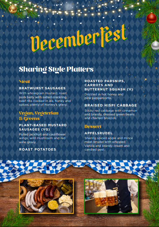 Guests will then be invited to step inside the magical Winter Lodge, complete with twinkling fairy lights, pinecone centrepieces, fir trees and festive scents to really give you that warm festive feel. Once seated at the table runners, you'll be served up a delicious sharing style platter of Bavarian-inspired foods (veggie and vegan option available).